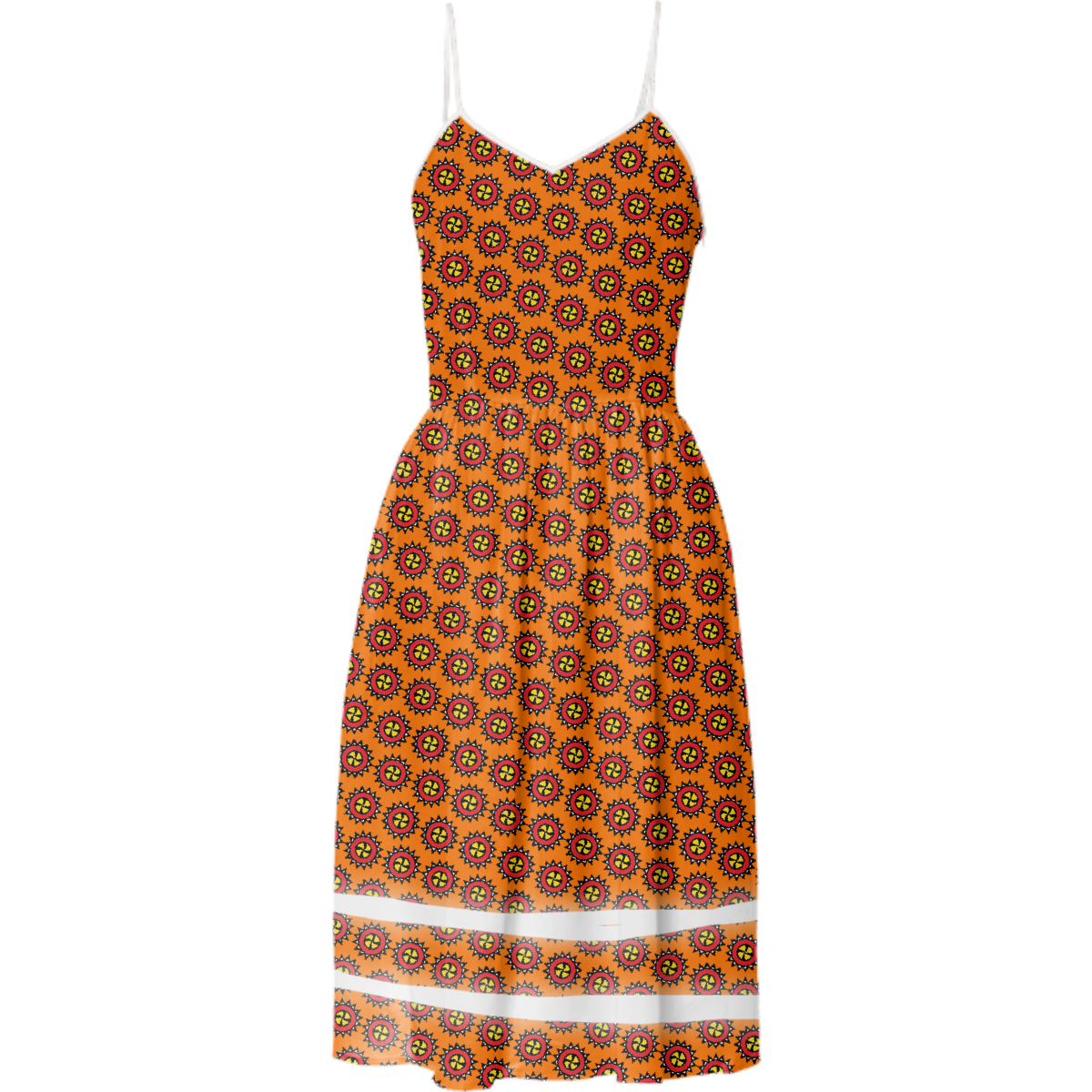 Knee length v-neckline dress with adjustable spaghetti straps shirred waist and invisible side seam zipper.
