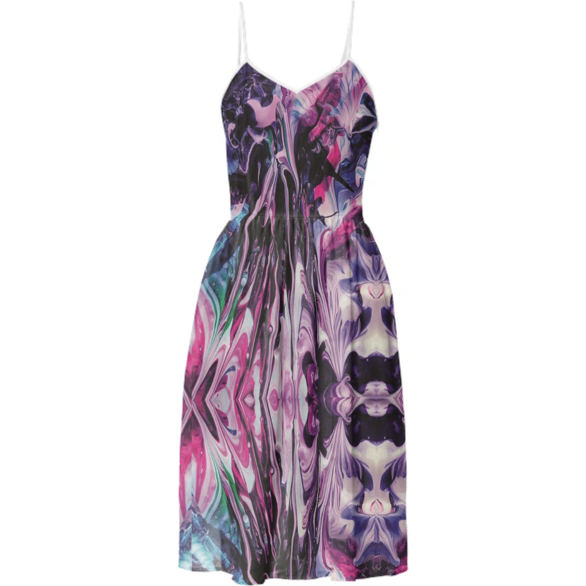 Knee length v-neckline dress with adjustable spaghetti straps shirred waist and invisible side seam zipper.
