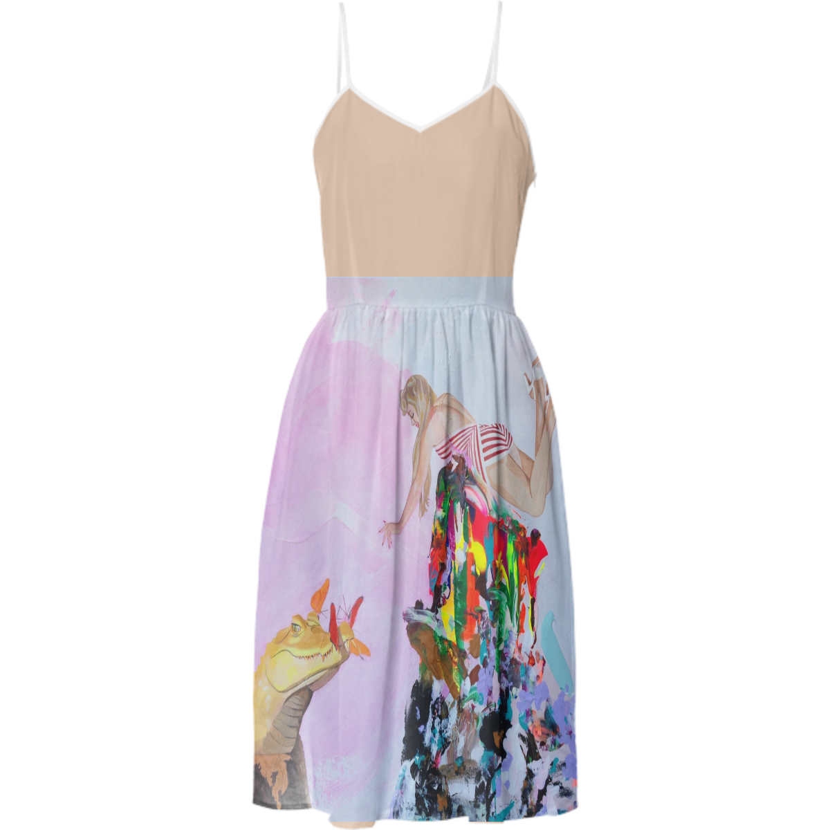 Knee length v-neckline dress with adjustable spaghetti straps shirred waist and invisible side seam zipper.