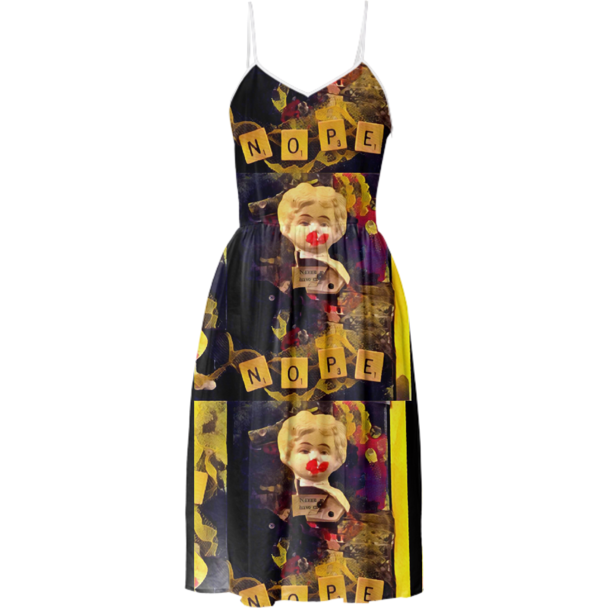 Knee length v-neckline dress with adjustable spaghetti straps shirred waist and invisible side seam zipper.