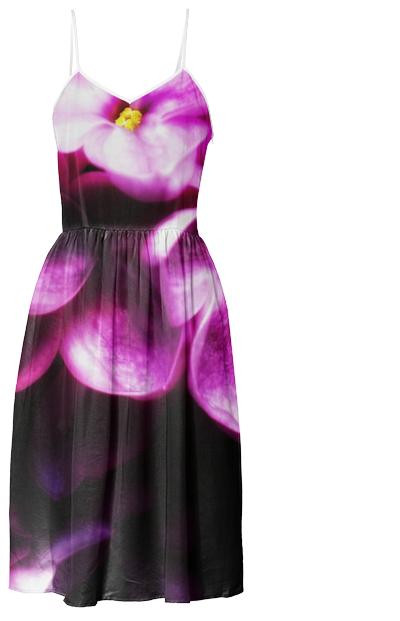 Knee length v-neckline dress with adjustable spaghetti straps shirred waist and invisible side seam zipper.