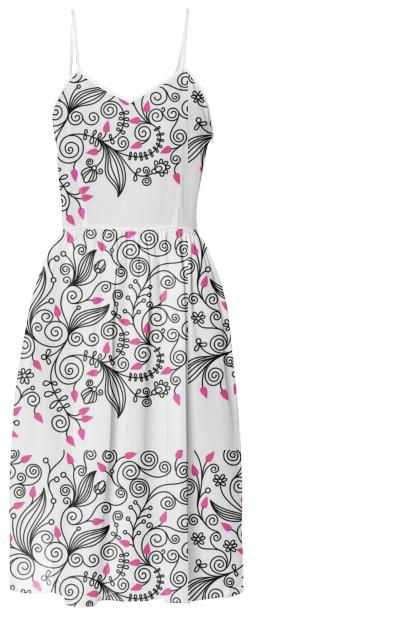 Knee length v-neckline dress with adjustable spaghetti straps shirred waist and invisible side seam zipper.