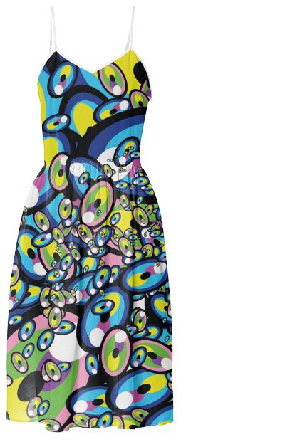 Knee length v-neckline dress with adjustable spaghetti straps shirred waist and invisible side seam zipper.