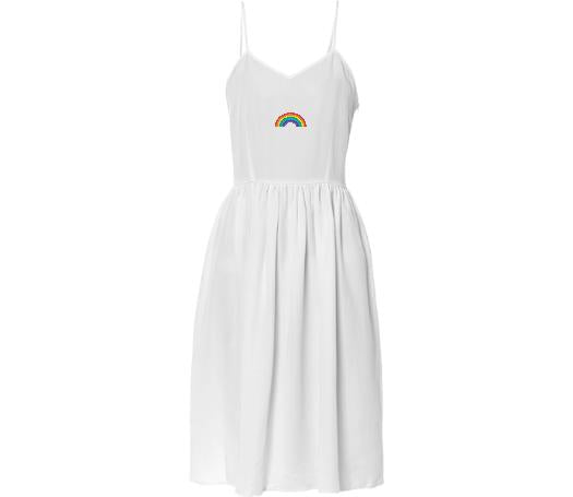Knee length v-neckline dress with adjustable spaghetti straps shirred waist and invisible side seam zipper.
