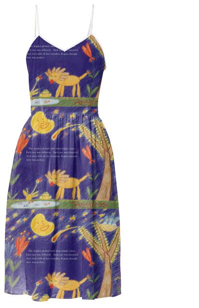Knee length v-neckline dress with adjustable spaghetti straps shirred waist and invisible side seam zipper.