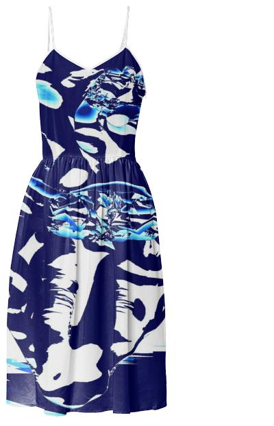 Knee length v-neckline dress with adjustable spaghetti straps shirred waist and invisible side seam zipper.