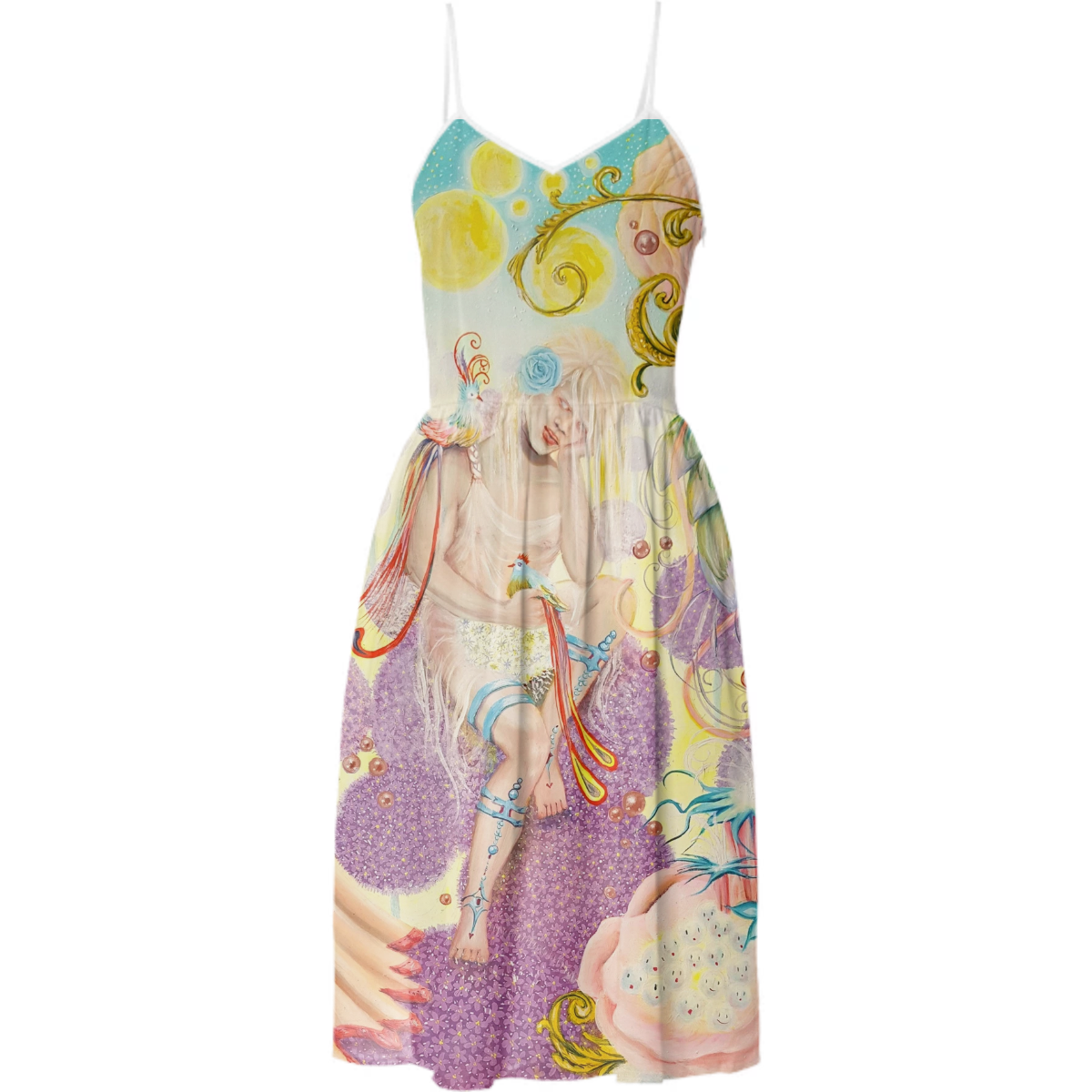 Knee length v-neckline dress with adjustable spaghetti straps shirred waist and invisible side seam zipper.