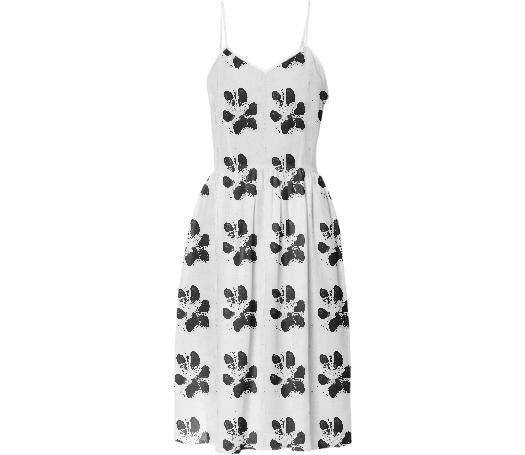 Knee length v-neckline dress with adjustable spaghetti straps shirred waist and invisible side seam zipper.