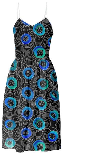 Knee length v-neckline dress with adjustable spaghetti straps shirred waist and invisible side seam zipper.