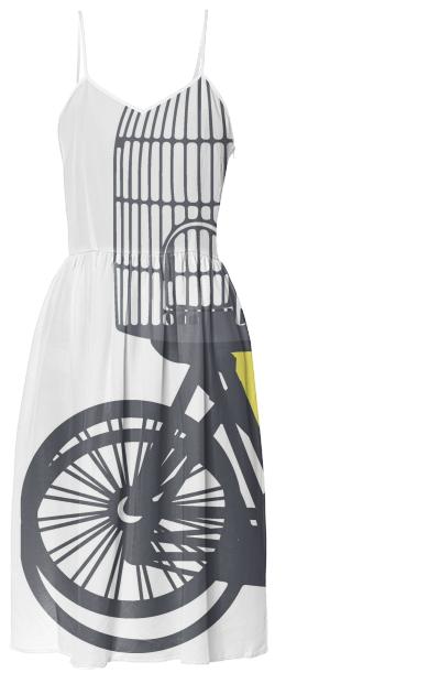 Knee length v-neckline dress with adjustable spaghetti straps shirred waist and invisible side seam zipper.