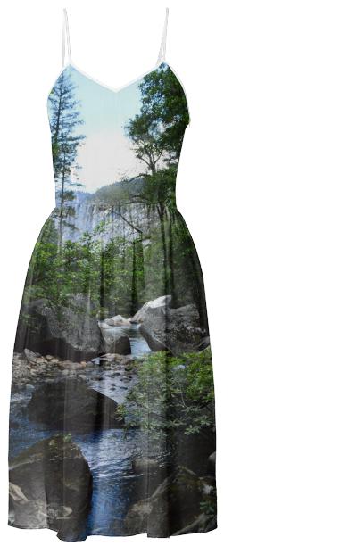 Knee length v-neckline dress with adjustable spaghetti straps shirred waist and invisible side seam zipper.