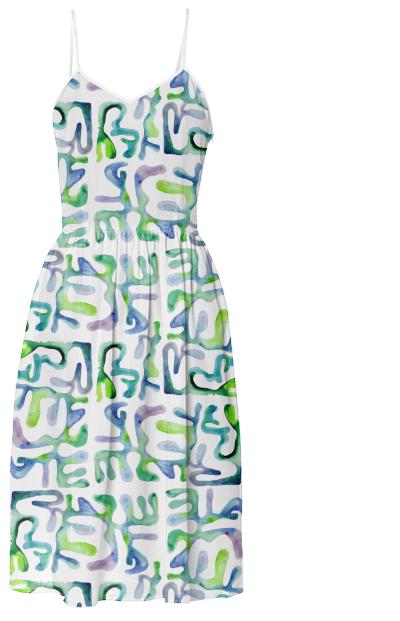 Knee length v-neckline dress with adjustable spaghetti straps shirred waist and invisible side seam zipper.