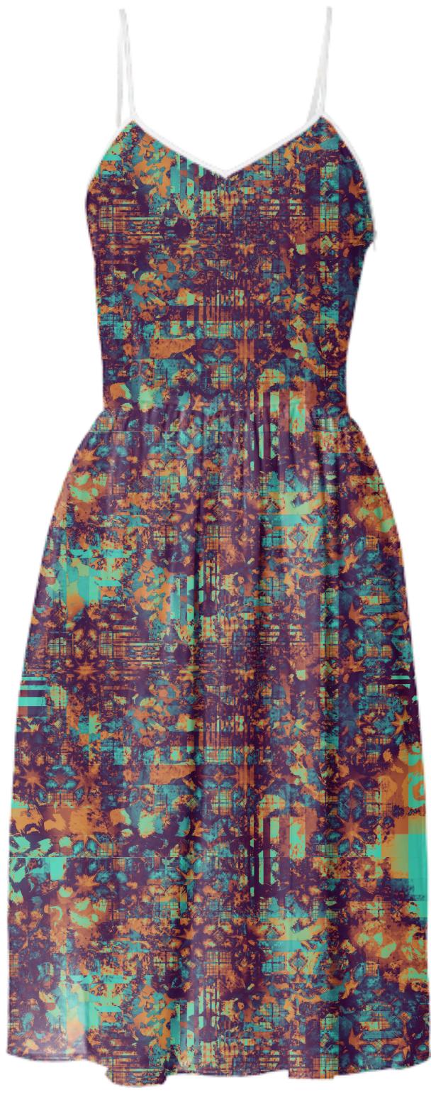 Knee length v-neckline dress with adjustable spaghetti straps shirred waist and invisible side seam zipper.