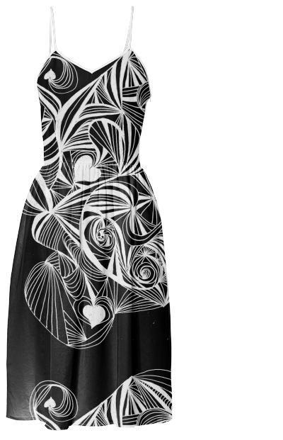 Knee length v-neckline dress with adjustable spaghetti straps shirred waist and invisible side seam zipper.