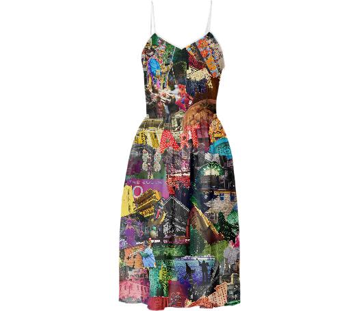 Knee length v-neckline dress with adjustable spaghetti straps shirred waist and invisible side seam zipper.