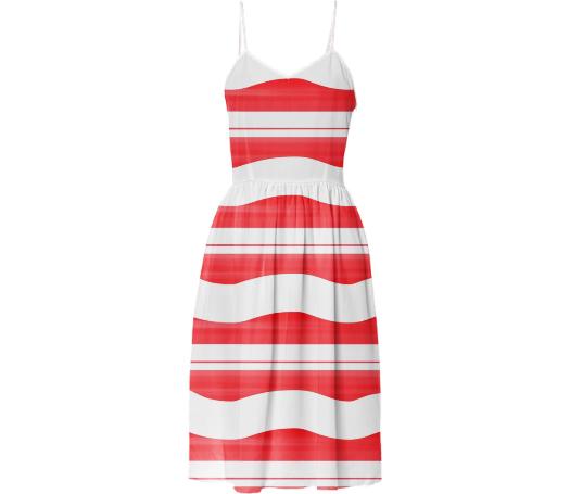 Knee length v-neckline dress with adjustable spaghetti straps shirred waist and invisible side seam zipper.