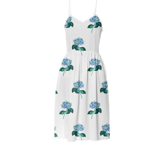 Knee length v-neckline dress with adjustable spaghetti straps shirred waist and invisible side seam zipper.