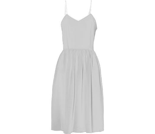 Knee length v-neckline dress with adjustable spaghetti straps shirred waist and invisible side seam zipper.