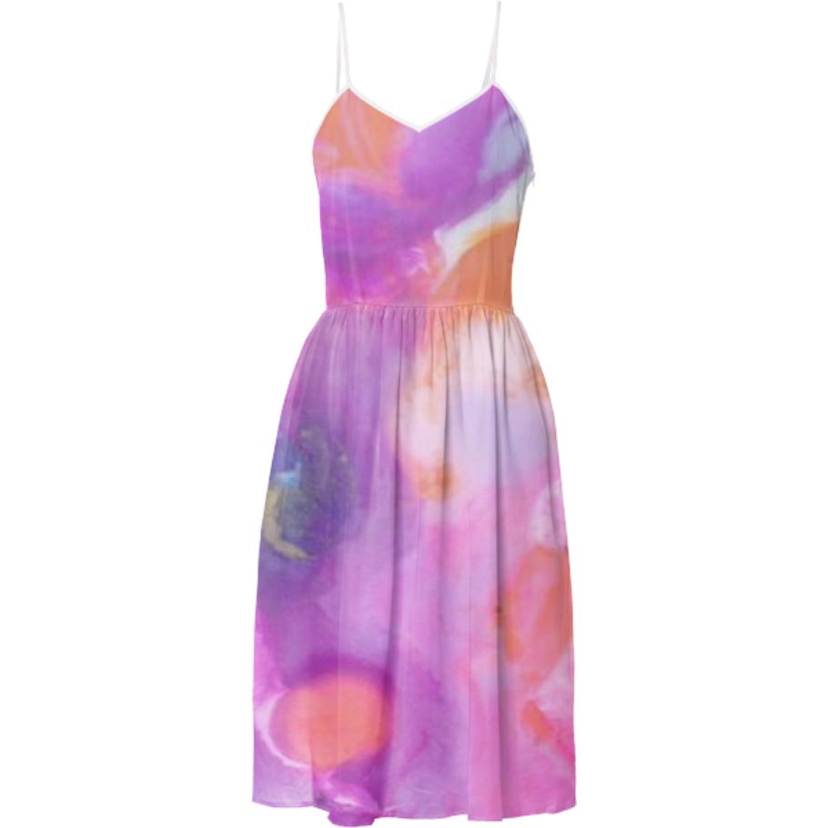 Knee length v-neckline dress with adjustable spaghetti straps shirred waist and invisible side seam zipper.