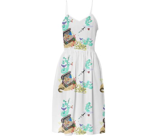 Knee length v-neckline dress with adjustable spaghetti straps shirred waist and invisible side seam zipper.