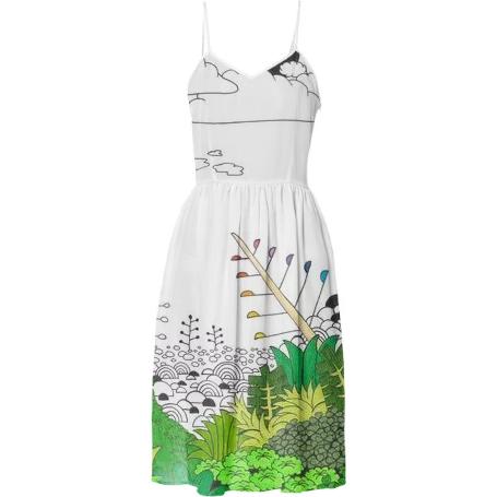 Knee length v-neckline dress with adjustable spaghetti straps shirred waist and invisible side seam zipper.