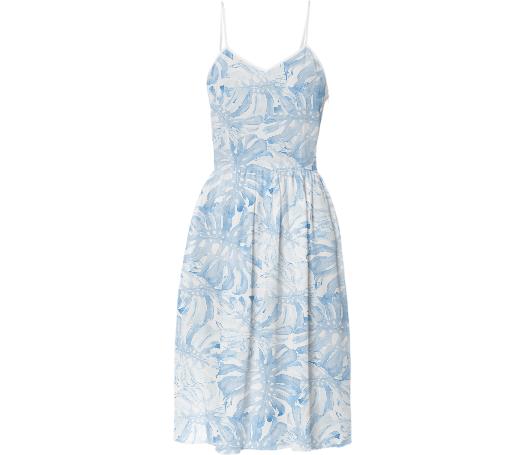 Knee length v-neckline dress with adjustable spaghetti straps shirred waist and invisible side seam zipper.