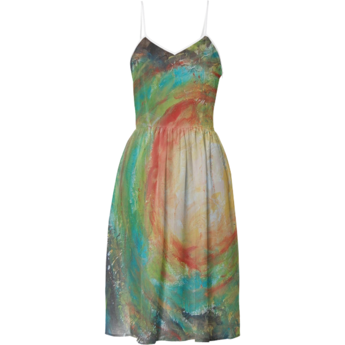 Knee length v-neckline dress with adjustable spaghetti straps shirred waist and invisible side seam zipper.