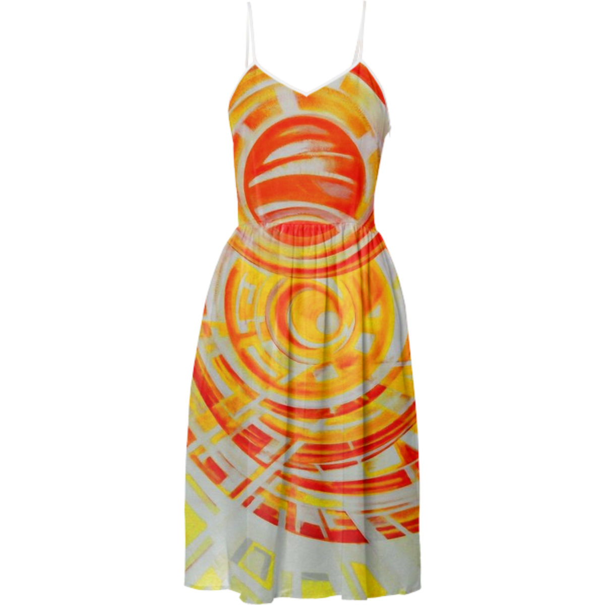 Knee length v-neckline dress with adjustable spaghetti straps shirred waist and invisible side seam zipper.