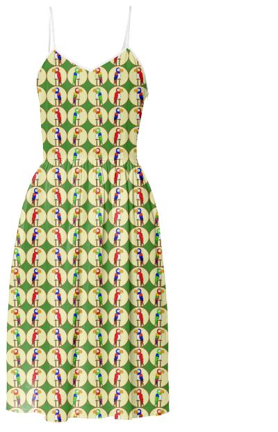 Knee length v-neckline dress with adjustable spaghetti straps shirred waist and invisible side seam zipper.