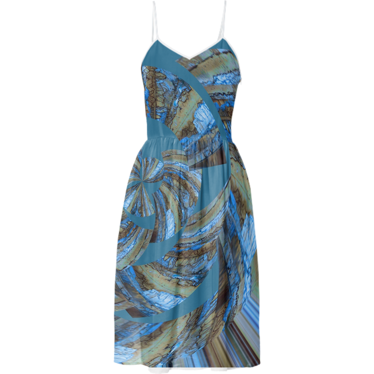 Knee length v-neckline dress with adjustable spaghetti straps shirred waist and invisible side seam zipper.
