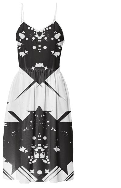 Knee length v-neckline dress with adjustable spaghetti straps shirred waist and invisible side seam zipper.