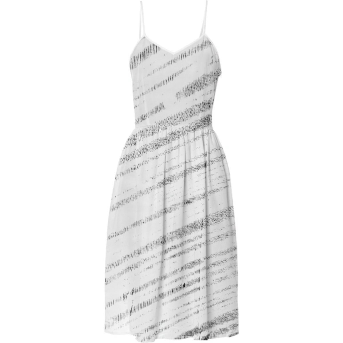 Knee length v-neckline dress with adjustable spaghetti straps shirred waist and invisible side seam zipper.