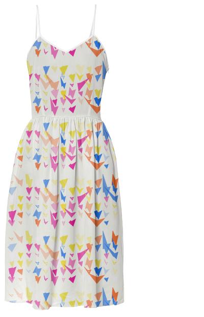Knee length v-neckline dress with adjustable spaghetti straps shirred waist and invisible side seam zipper.