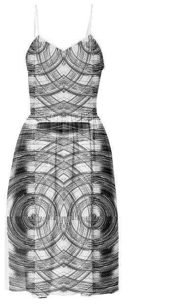 Knee length v-neckline dress with adjustable spaghetti straps shirred waist and invisible side seam zipper.