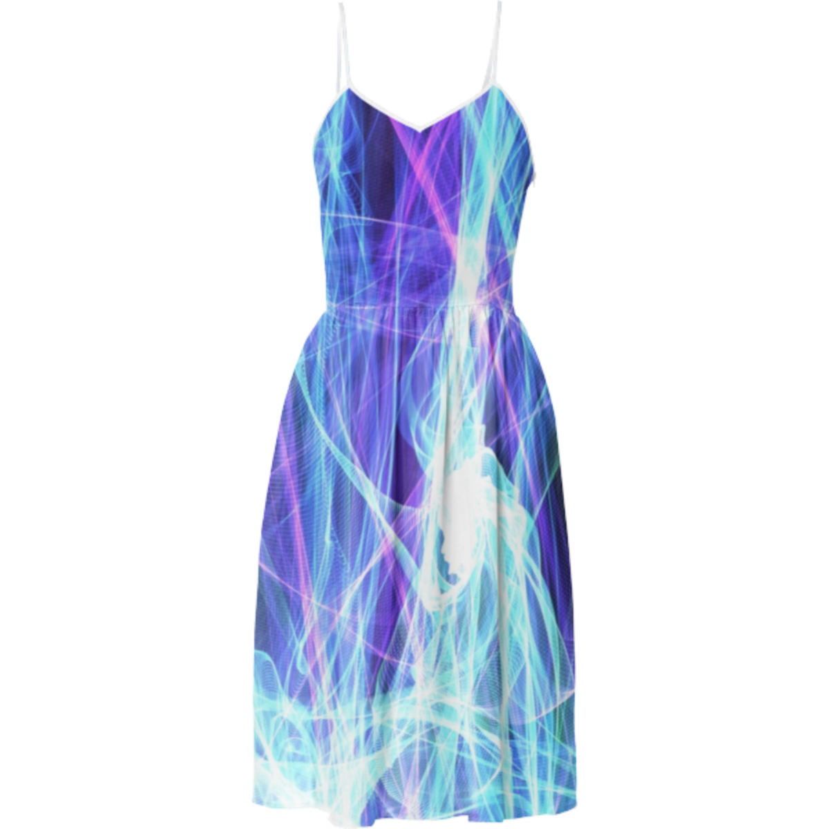 Knee length v-neckline dress with adjustable spaghetti straps shirred waist and invisible side seam zipper.