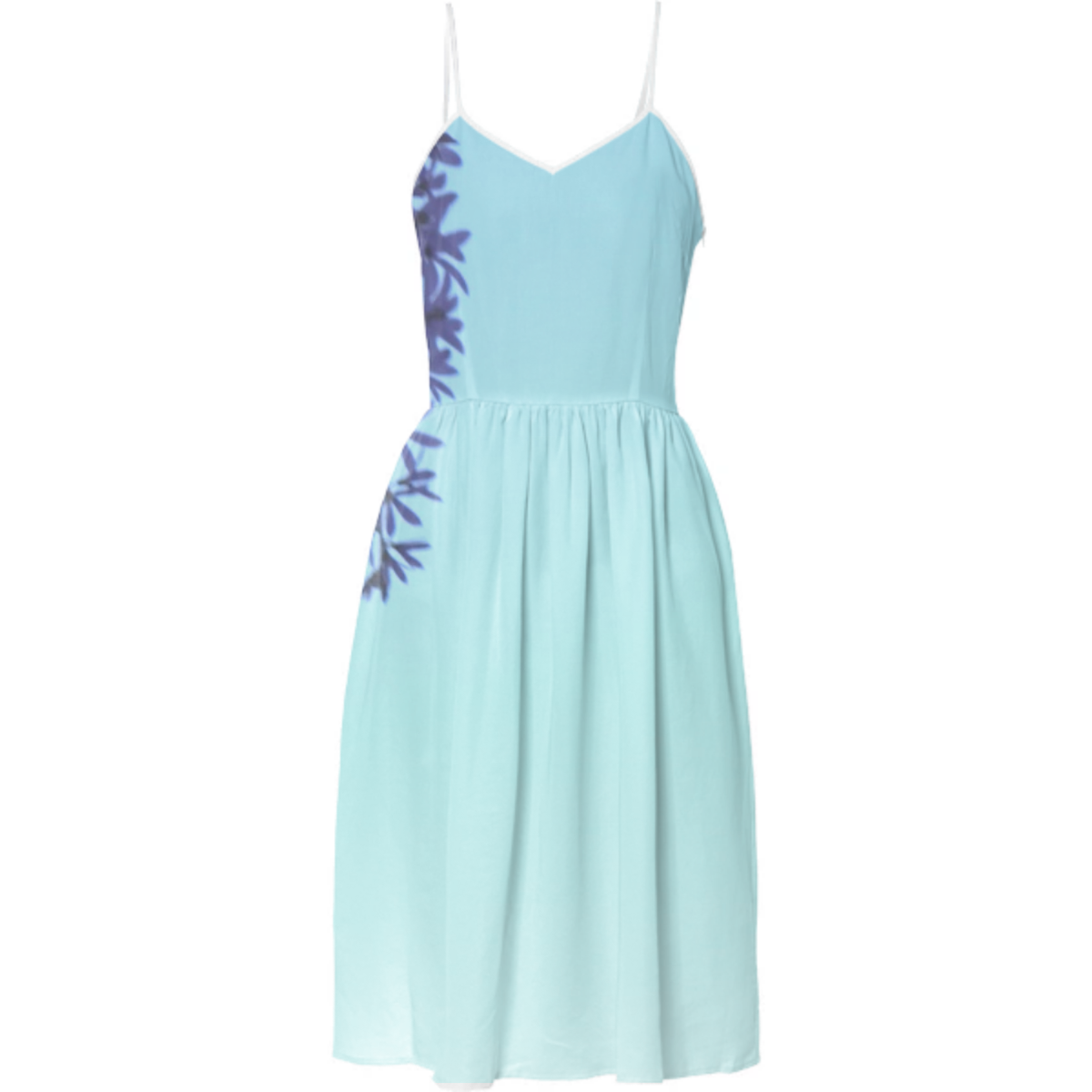 Knee length v-neckline dress with adjustable spaghetti straps shirred waist and invisible side seam zipper.