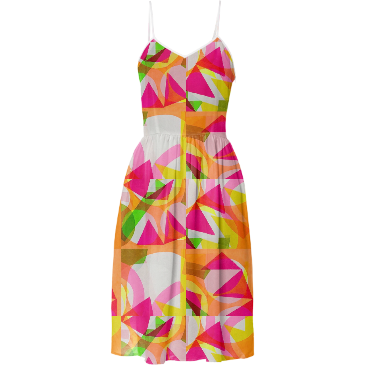 Knee length v-neckline dress with adjustable spaghetti straps shirred waist and invisible side seam zipper.