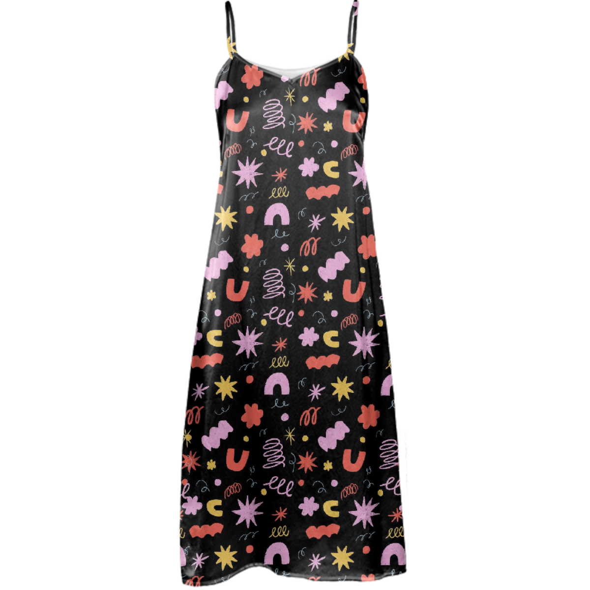 Loose flowy slip dress with adjustable spaghetti straps and 4 inch side slits.