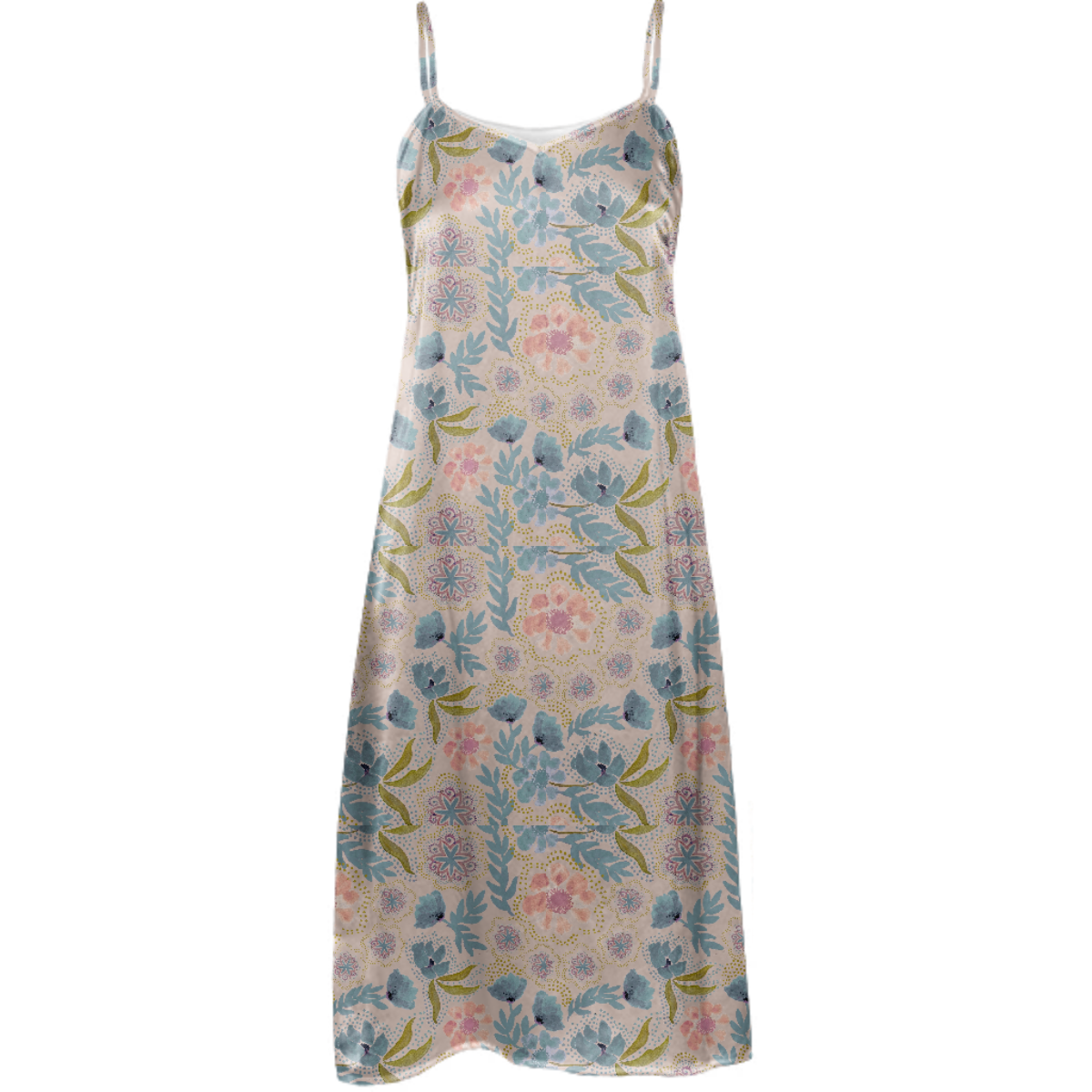 Loose flowy slip dress with adjustable spaghetti straps and 4 inch side slits.