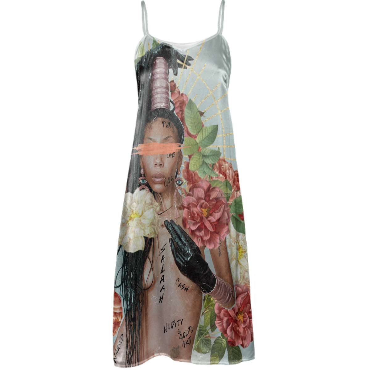 Loose flowy slip dress with adjustable spaghetti straps and 4 inch side slits.