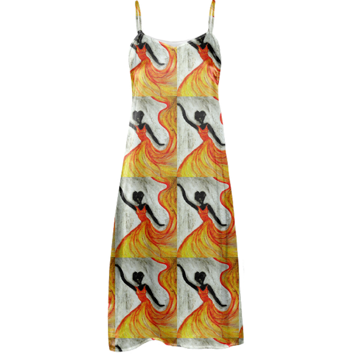 Loose flowy slip dress with adjustable spaghetti straps and 4 inch side slits.