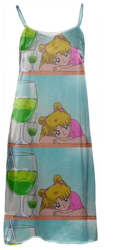Loose flowy slip dress with adjustable spaghetti straps and 4 inch side slits.