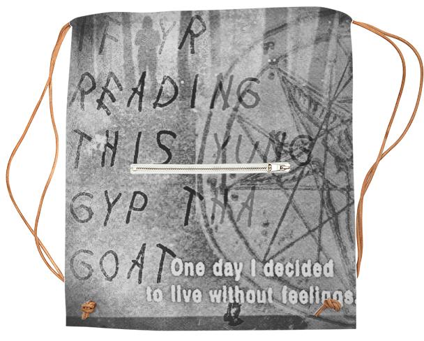 Drawstring sports bag with outside zip up pocket and black or white drawstring straps.