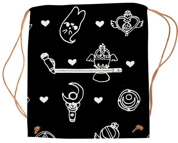 Drawstring sports bag with outside zip up pocket and black or white drawstring straps.