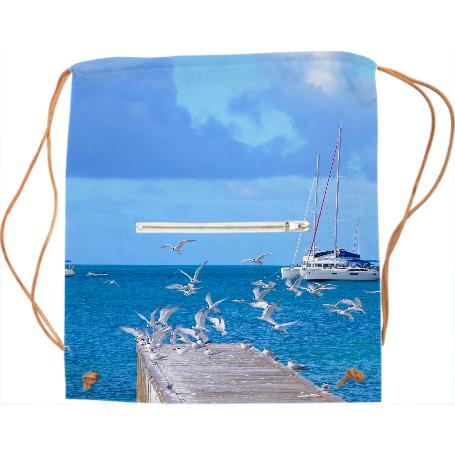 Drawstring sports bag with outside zip up pocket and black or white drawstring straps.