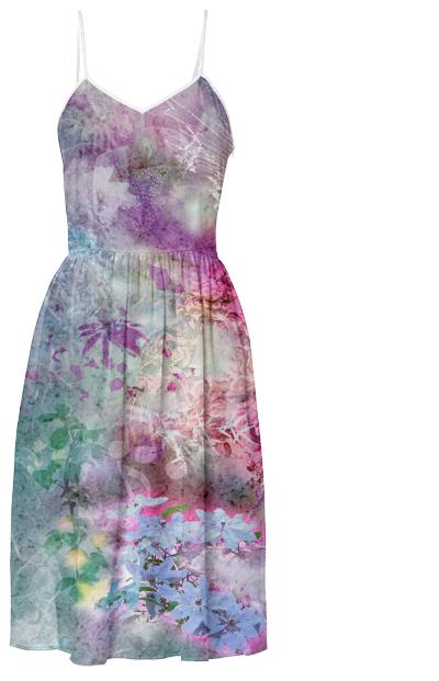 Knee length v-neckline dress with adjustable spaghetti straps shirred waist and invisible side seam zipper.
