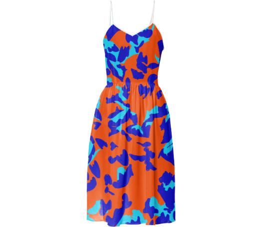Knee length v-neckline dress with adjustable spaghetti straps shirred waist and invisible side seam zipper.