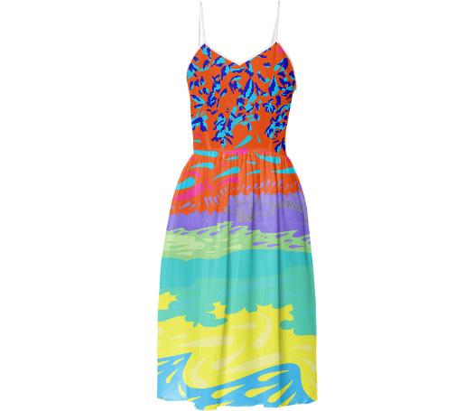 Knee length v-neckline dress with adjustable spaghetti straps shirred waist and invisible side seam zipper.