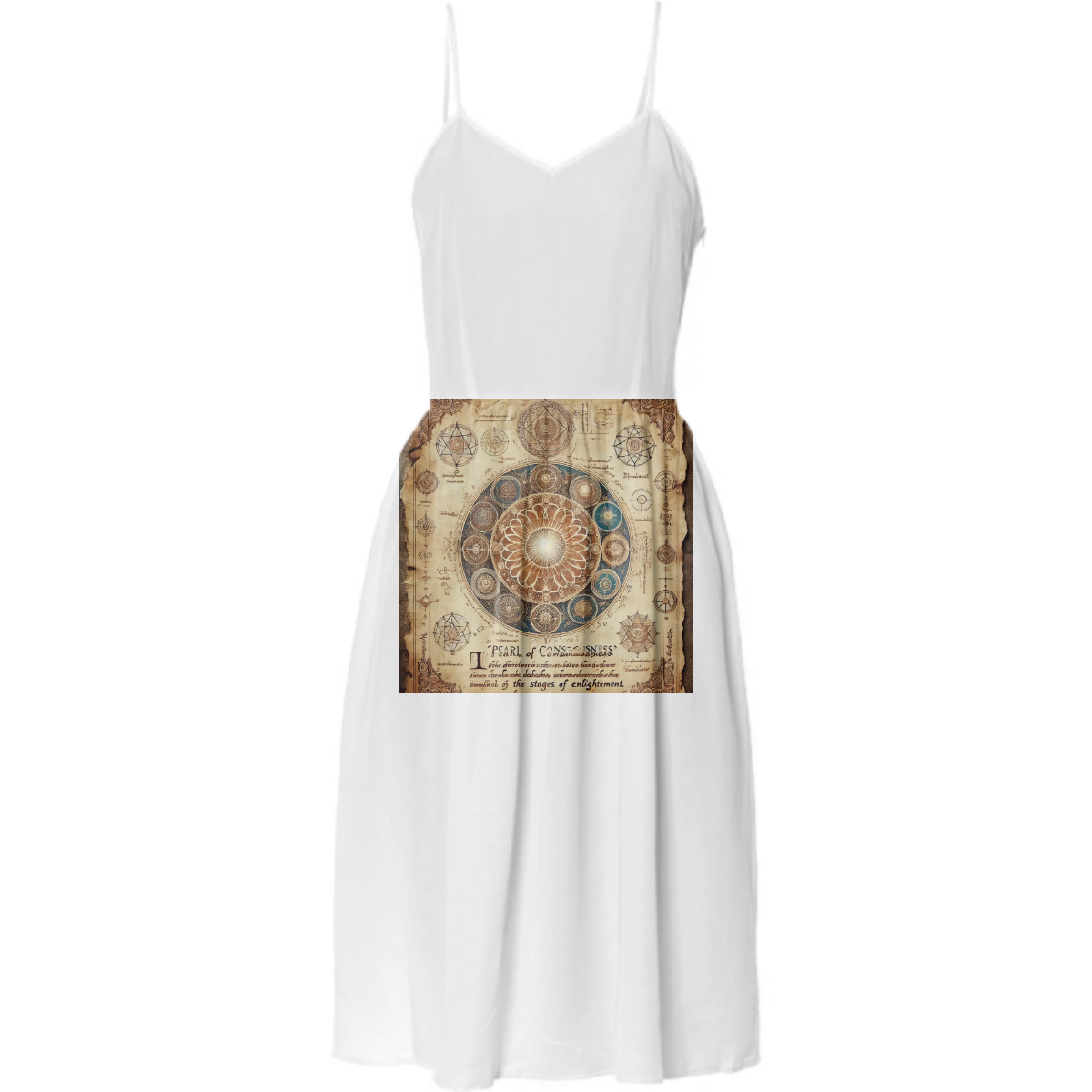 Knee length v-neckline dress with adjustable spaghetti straps shirred waist and invisible side seam zipper.