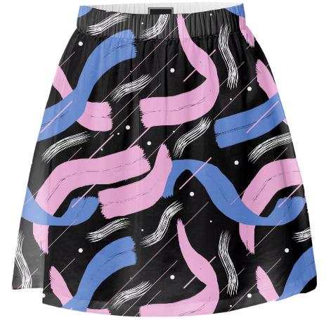 Basic short a-line skirt with a nice drape elastic waistband and side seam pockets.